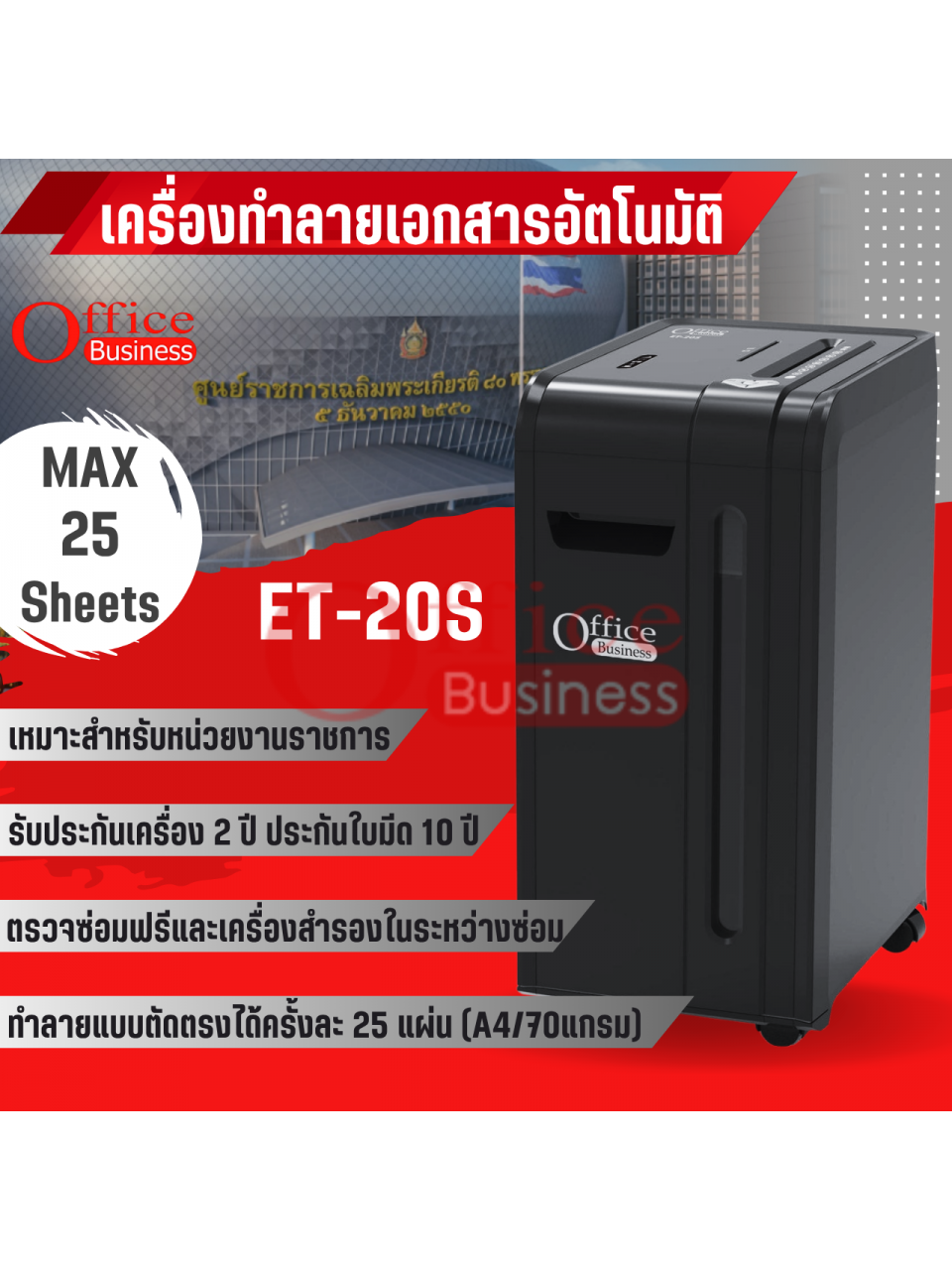 เครื่องทำลายเอกสารแบบตัดเส้นตรง ทำลายครั้งละ 20 แผ่น (A4) ยี่ห้อ OFFICE BUSINESS รุ่น ET-20S (3.9มม.) ประกันเครื่อง 2 ปี ใบมีด 10 ปี บริการหลังการขาย (On-site)