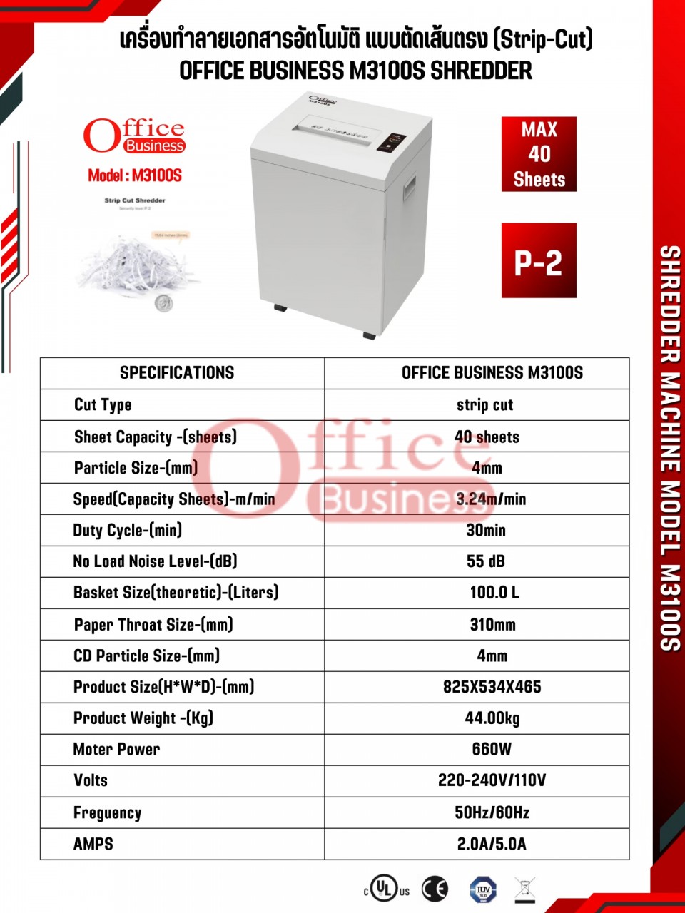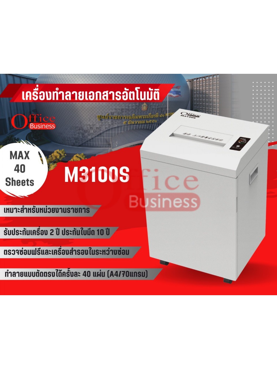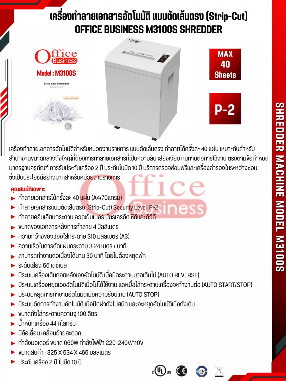 เครื่องทำลายเอกสารแบบตัดเส้นตรง ทำลายครั้งละ 40 แผ่น (A3) ยี่ห้อ OFFICE BUSINESS รุ่น M3100S (4มม.) ประกันเครื่อง 2 ปี ใบมีด 10 ปี บริการหลังการขาย (On-site)