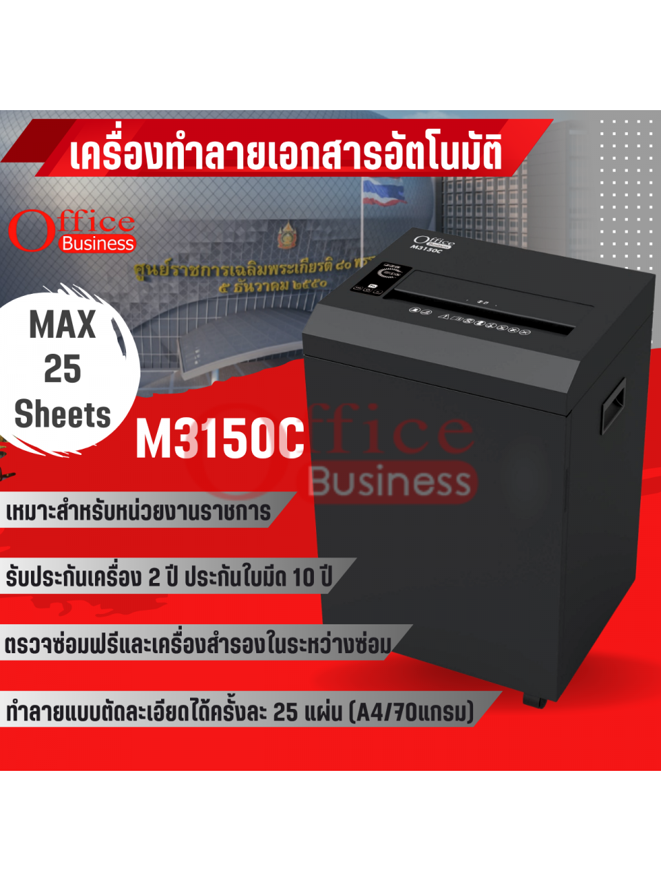 เครื่องทำลายเอกสารแบบตัดละเอียด ทำลายครั้งละ 20 แผ่น (A3) ยี่ห้อ OFFICE BUSINESS รุ่น M3150C (3.9x4มม.) ประกันเครื่อง 2 ปี ใบมีด 10 ปี บริการหลังการขาย (On-site)