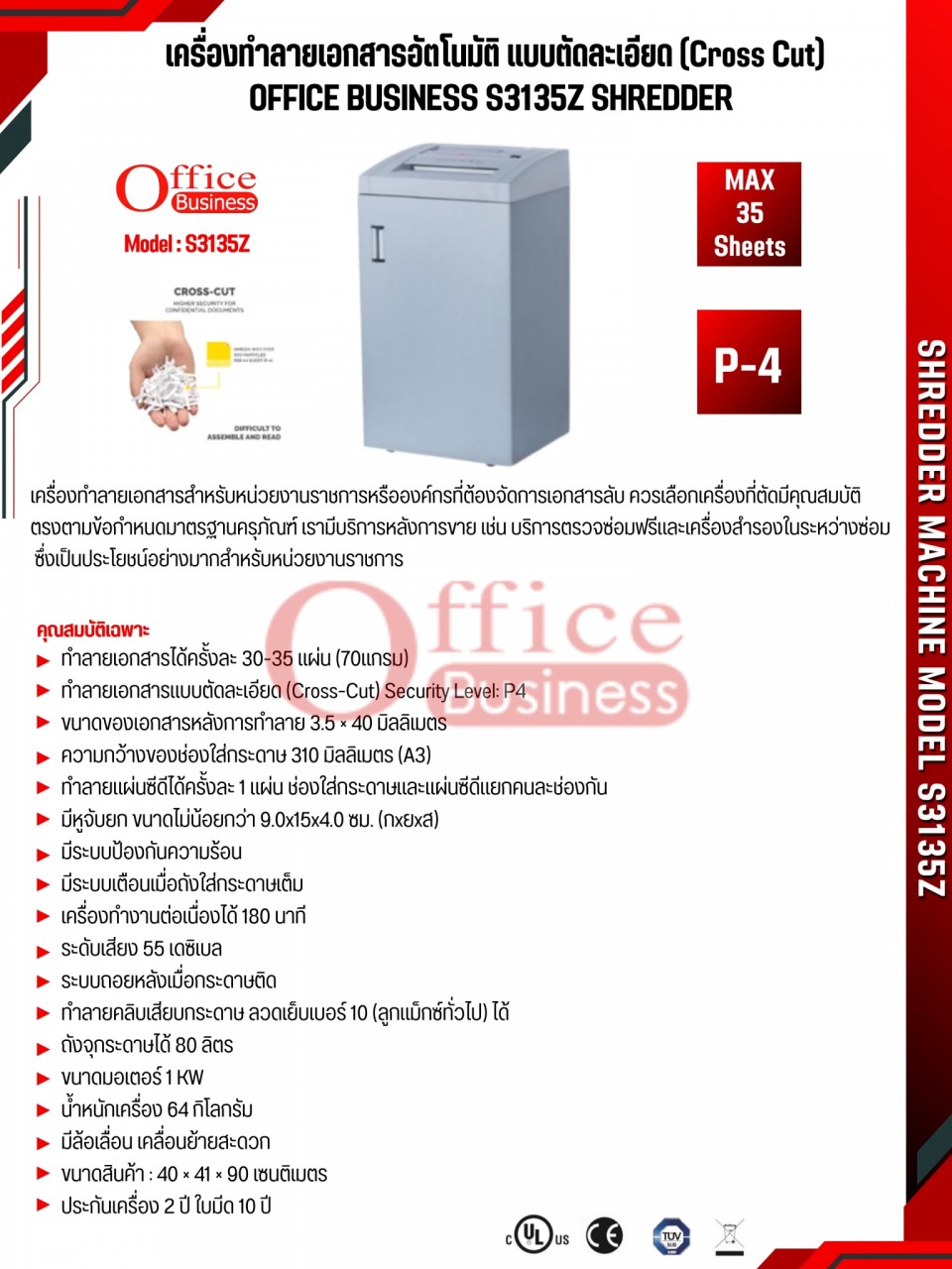 เครื่องทำลายเอกสาร ยี่ห้อ OFFICE BUSINESS รุ่น S3135Z (30-35 แผ่น)