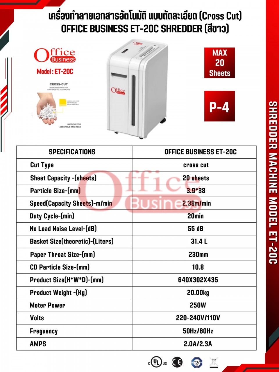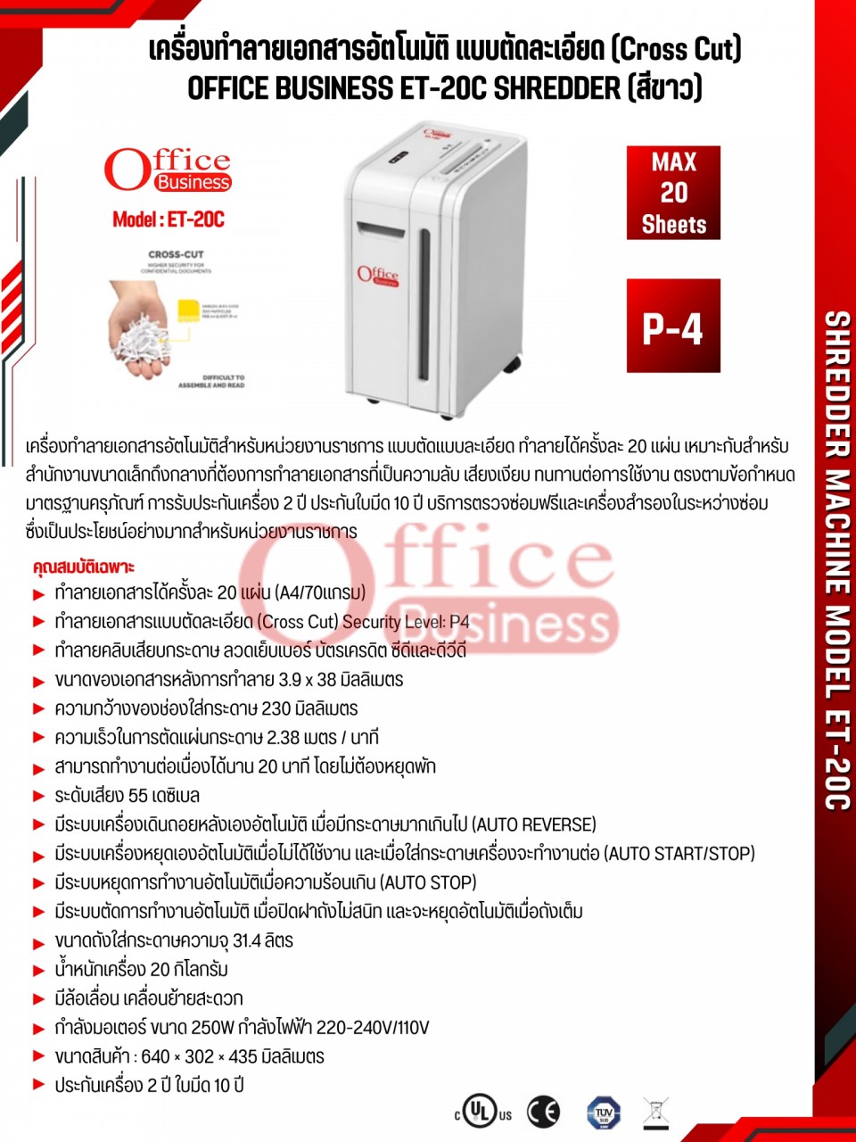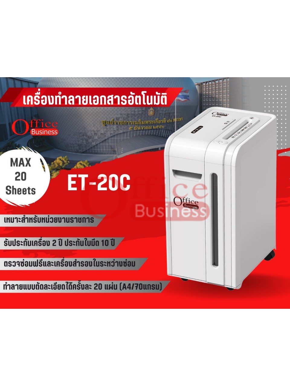 เครื่องทำลายเอกสารแบบตัดละเอียด ทำลายครั้งละ 20 แผ่น (A4) ยี่ห้อ OFFICE BUSINESS รุ่น ET-20C (3.9x38มม.) รับประกัน 2 ปี ใบมีด 10 ปี บริการหลังการขาย (On-site)