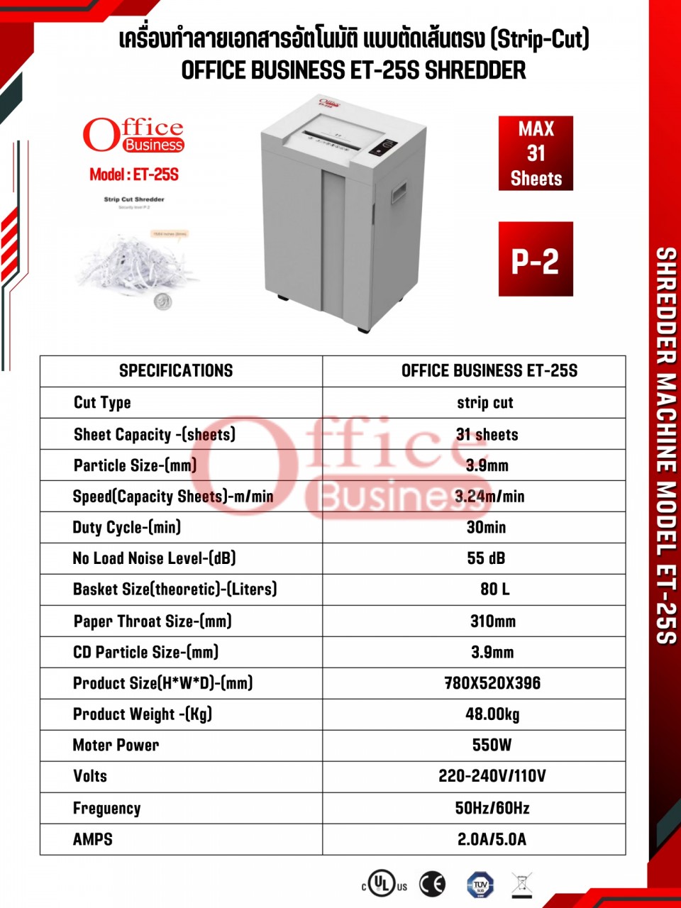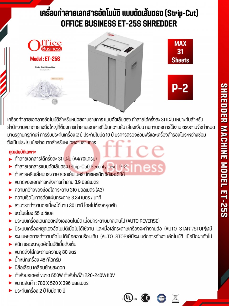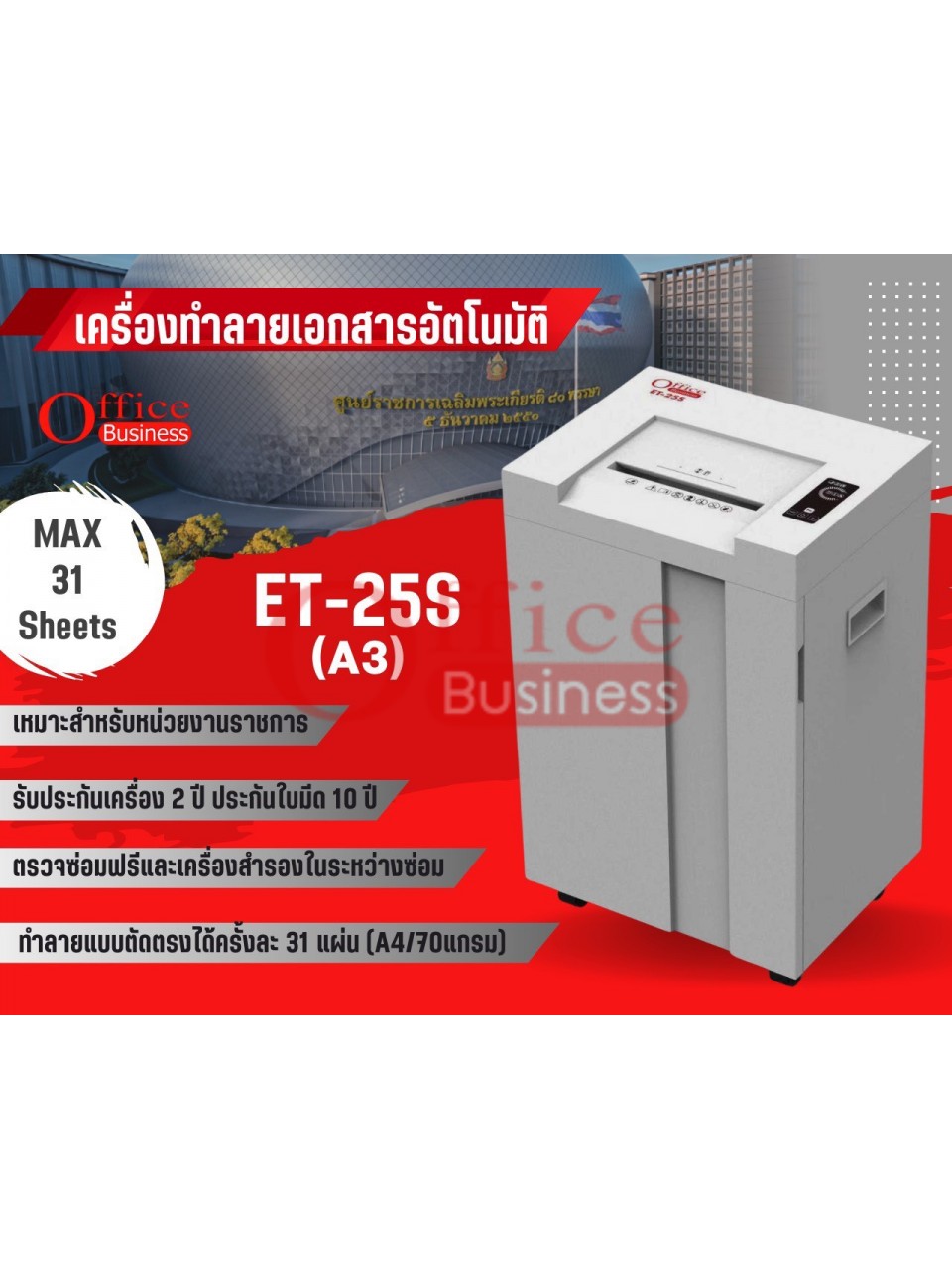 เครื่องทำลายเอกสารแบบตัดเส้นตรง ทำลายครั้งละ 30 แผ่น (A3) ยี่ห้อ OFFICE BUSINESS รุ่น ET-25S (3.9มม.) ประกันเครื่อง 2 ปี ใบมีด 10 ปี บริการหลังการขาย (On-site)